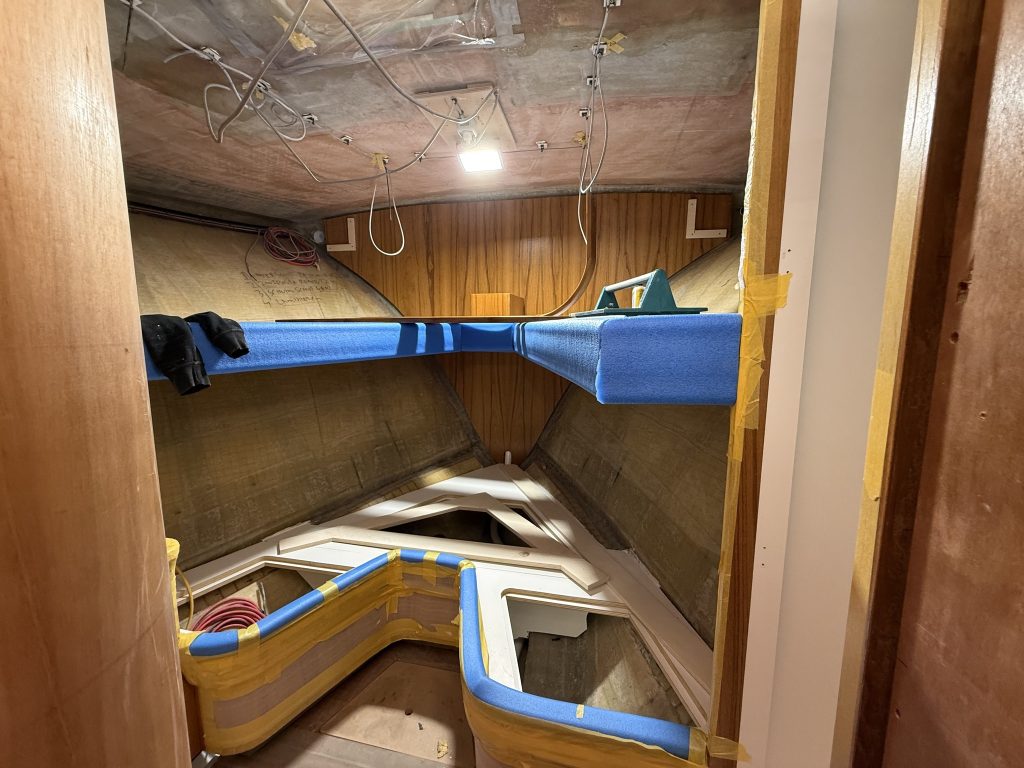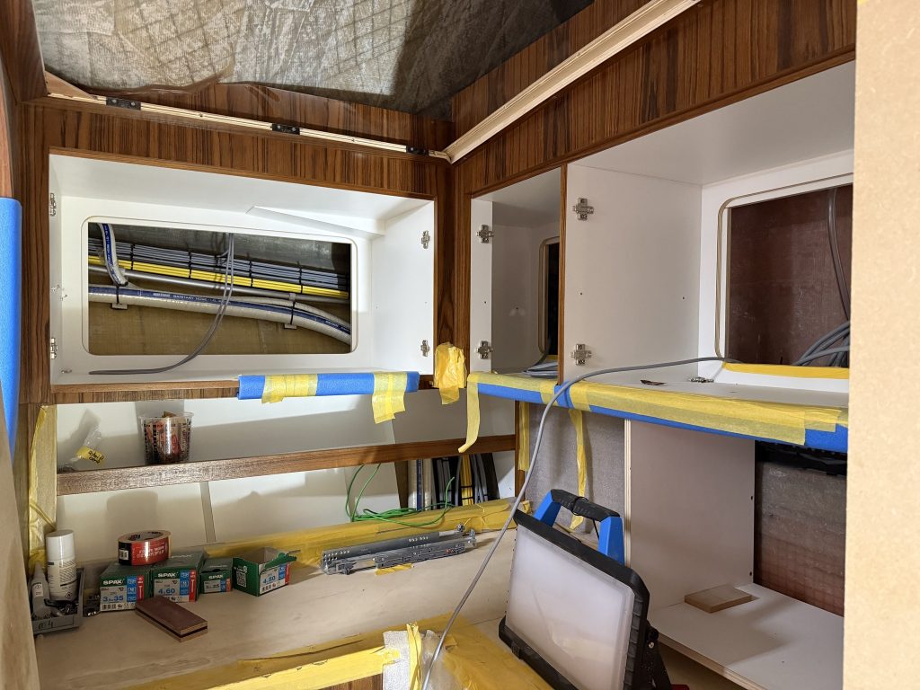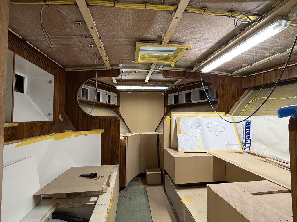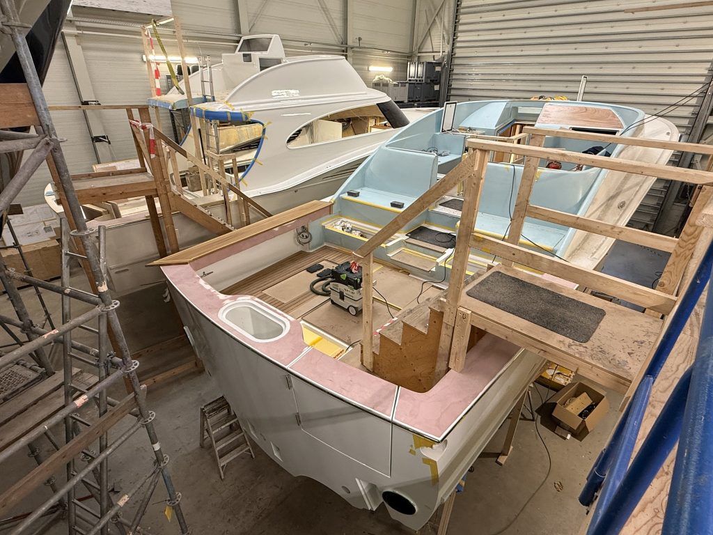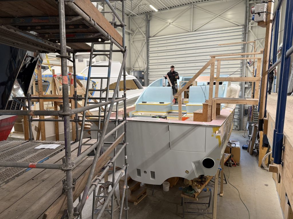 Hull number 2 is the first Express model of the series. She shares the same hull as the Flybridge version, but with a different deck. The technical systems are largely in place, the engines and tanks have been installed, and the cockpit has already been fitted with teak. The striking teak coverboards, the true eyecatchers of this boat, are currently being built. Inside, much of the interior is already in, and the boat has been fully painted. Over the coming weeks, we will continue with the ceilings, fit the coverboards, and move on to final assembly.