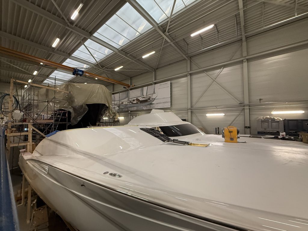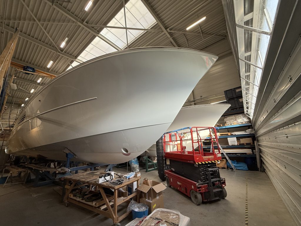 Hull number 3, a second Flybridge, is following close behind. She has also been fully painted and is now back in the hall, right alongside the Express. Most of the technical systems have been installed, and we are currently fitting the interior. Once that is in place, work will continue on deck and in the cockpit.